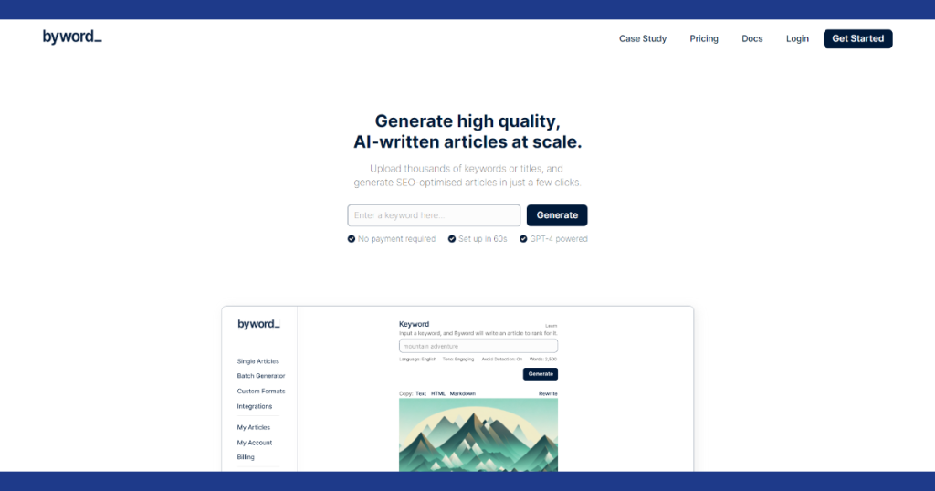 Byword یک ابزار خلاقانه تولید محتوا مبتنی بر هوش مصنوعی است که فرآیند تولید محتوا را ساده می کند. ایجاد مقالات بهینه شده برای سئو برای کسب و کارها. با Byword.ai، کاربران به راحتی می توانند مقالات با کیفیت بالا را در مقیاس تولید کنند، که آن را به یک دارایی ارزشمند برای بازاریابی محتوا و استراتژی های سئو تبدیل می کند.